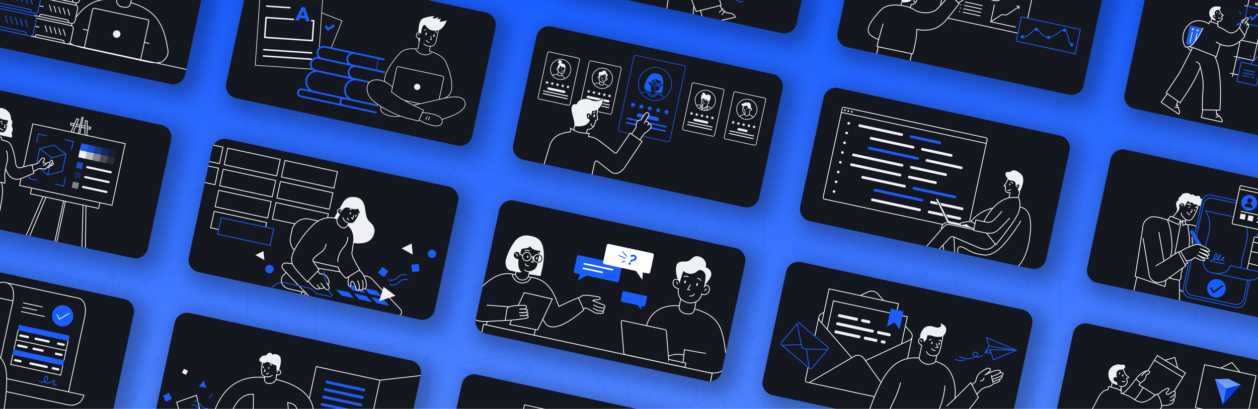 We knew the existing interface of the workspace sections had to be included to showcase example tabs organized. So I made the creative decision to have the illustrative header in black, a shade darker than the steel blue description section. I introduced character illustrations that worked with the background elements to represent each industry, and this was what introduced character illustration to the overall Workona brand, as Workona started as a consumer product and we want to show how people-friendly this productivity tool is.